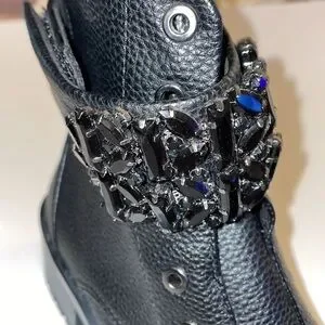 Elegant black combat boots with decorative embellishments. Durable and stylish.