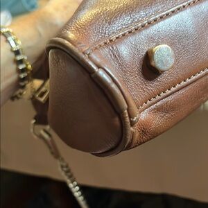 Chic leather crossbody with chain strap. Features decorative scarf and signature clasp. Silver studs add to the advant gard nature of this bag; on strap and on bottom. Plenty of compartments for a medium sized bag. Measures 12” wide, 8” tall, 2.5” deep with 44” chain. A great bag to stand out from the crowd with the more known designers❣️Added a twilly for color and flair 💜🌴💜