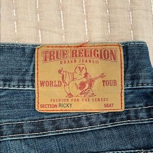 Classic straight fit jeans. Dark blue wash. Signature stitching detail. 33” waist, 34” inseam
