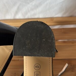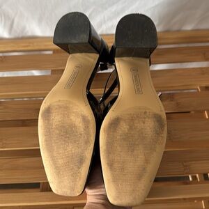 Elegant black patent leather heels. Features ankle strap and block heel. Perfect for any occasion.