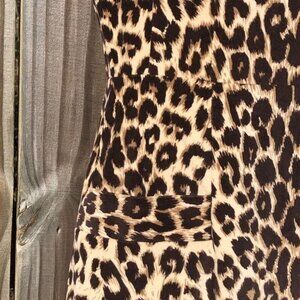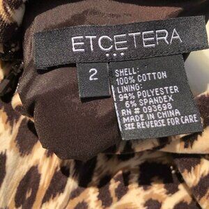 Cheetah print dress from Etcetera. Features short sleeves and velvet-like fabric. Cowl neckline with knot detail. Two front pockets. Fully lined. Hidden back zipper. Shell: 100% Cotton. Lining: 94% Polyester, 6% Spandex. Dry clean. Excellent condition. Size 2, equivalent to a size XS.