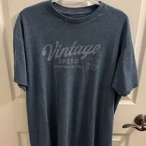 Soft blue tee with vintage motorcycle motor graphic. Perfect for casual wear.