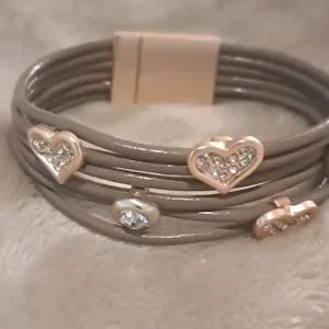 This elegant bracelet features heart charms with sparkling accents, perfect for adding a touch of sophistication to any outfit. The bracelet's gray.tan and gold tones make it versatile for any occasion.