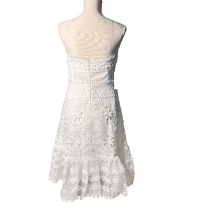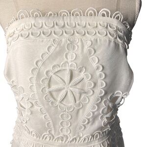 Step into elegance with this white strapless embroidered lace dress from Gracia. Featuring intricate floral embroidery, scalloped hem, and structured bodice, this piece is a timeless stunner perfect for summer events, bridal showers, or vacations.