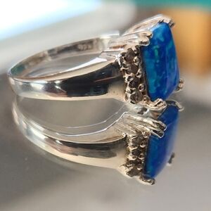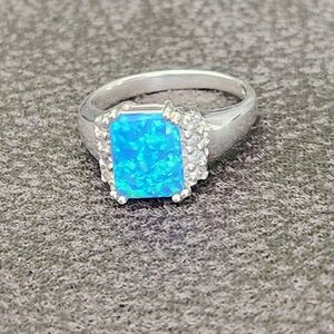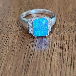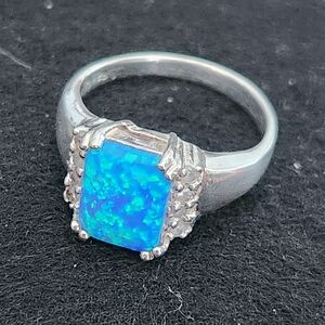This stunning blue opal ring features a vibrant blue stone set in a sleek silver band with white gems adorning the edges. 925 sterling silver, size 7. Boho country chic!