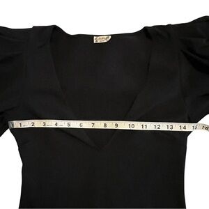 This elegant black top features a stylish deep V-neck design, perfect for date night or an elevated sexy look. Featuring a thong style snap closure and exaggerated puff sleeves, this bodysuit is a show stopper. In excellent condition. Size S