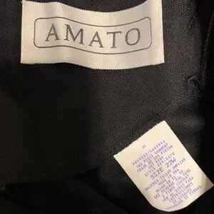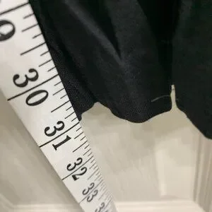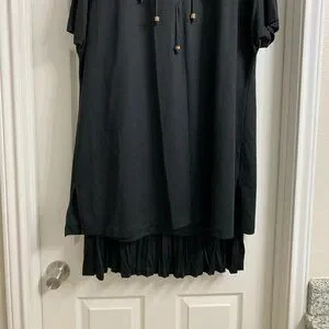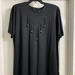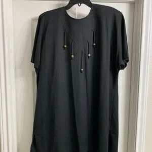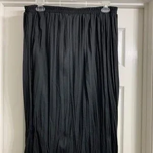 Beautiful, jet-black two-piece set in excellent condition. The blouse is long. Back zipper closure. Skirt is a pull-on with an elastic waistband. Size 22W. Material is 100% polyester. The skirt length is 31". Smoke free/pet free home.