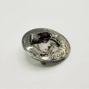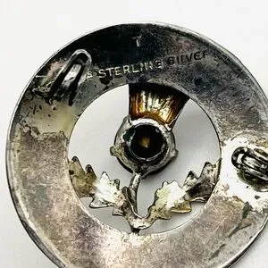 For your consideration is a vintage Sterling Silver thistle brooch. It features a thistle with an Amethyst stone in a circle brooch. The piece has intricate details. A beautiful dainty collectible brooch.