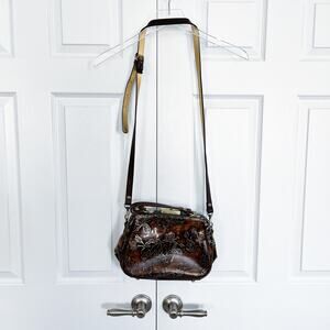 Vintage leather-wrapped frame satchel with a removable, adjustable strap for shoulder use. Push-lock closure at deep-embossed leather tab. Signature antique brass-tone exterior hardware, heavy handcrafted stitching & burned edge finish. 1 interior zip pocket & 2 slip pockets