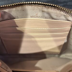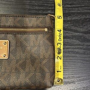 Elegant Michael Kors wristlet in dark brown. Features gold-tone hardware and secure zip closure. Perfect for essentials.