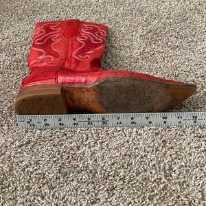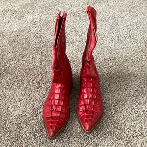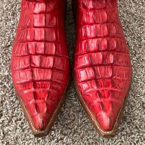 Stand-out in style in these vibrant red cowboy/cowgirl boots. Los Altos hand-makes these high-quality boots in genuine crocodile leather. These are beautifully embossed and highlighted with white overstitching. Perfect for adding a bold touch to any outfit: jeans, little boho & gypsy dresses, leggings, prairie skirts…
