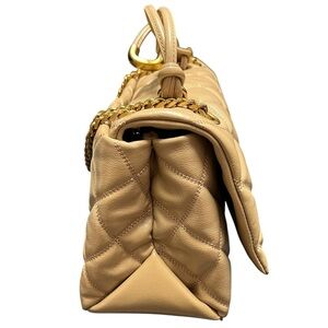 Marc Jacobs. Tan. Leather. Quilted. Diamond. Double Leather Short Handle. Long Shoulder Chain. Flap w/ Twist Lock. Flat Bottom. Back Exterior Pocket w/ Magnetic Closure. Gold Hardware. Brown Interior. One Zip Interior Pocket. In excellent preloved condition.