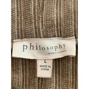This brown ribbed cowl neck sweater by Philosophy Republic Clothing is designed for comfort and warmth. Crafted from 100% Polyester, its relaxed fit and cozy neck make it ideal for cooler temperatures.