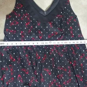 Torrid Retro Chic 50’s Sunglasses Rockabilly Pinup Swing Dress with red framed glasses and skull accents.