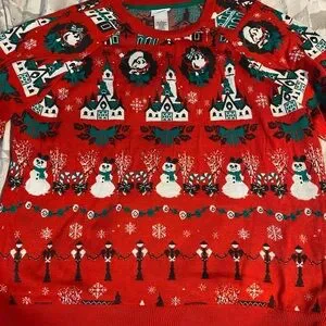 Charming unisex Disney sweater with festive snowmen and castle motifs. Bright red with green accents. $40, worn once. Must pick up.