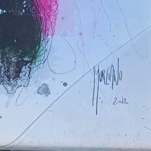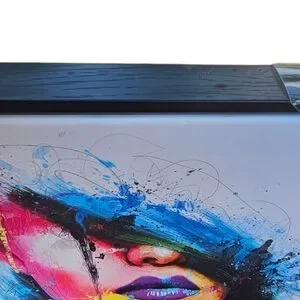 Vibrant abstract portrait art print with splashes of blue, pink, and yellow. Perfect for modern decor.