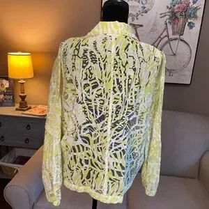Chico's Jacket. sz XL/16 (Chico sz 3) Fun and unique jacket! Fabric is very lightweight styled with a "burn out" design, (totally sheer in specific design), animal print. Draw string at front collar and bottom of jacket, 2 stylish pockets, elastic sleeve, Hardly worn, very good condition, examine pics. Check out my other items for a bundle discount and save on shipping!