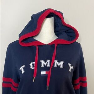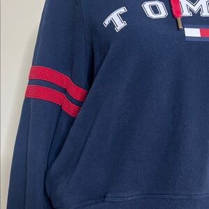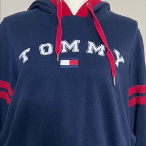 Dark blue sweatshirt with red accents. Features Tommy branding on front.