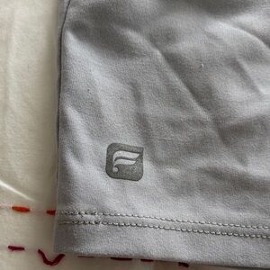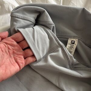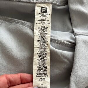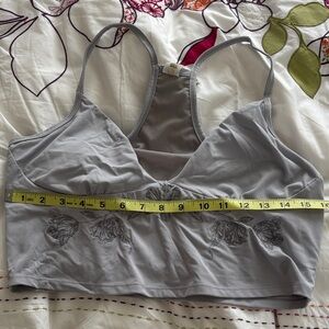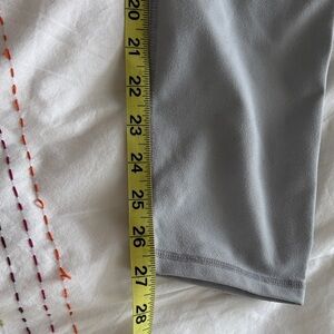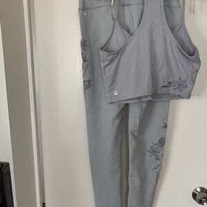 Comfortable and feminine with this gray embroidered flowers. The pants are 7/8 length. The material is their powerhold material. The top is made from a thinner material.