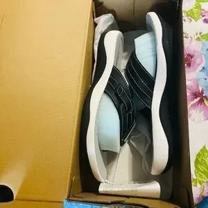 Comfortable Clarks slide sandals. Black straps with white sole. Ideal for everyday wear. Never worn, brand new, size 7 M.