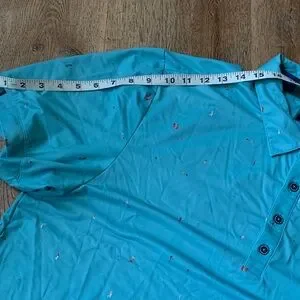Excellent condition 100% authentic aqua green and multi colored short sleeve 92% polyester 8% spandex
