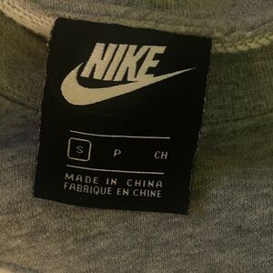 Stylish Nike sweatshirt with a tri-tone design. Features gray, cream, and purple colors. Perfect for casual wear.