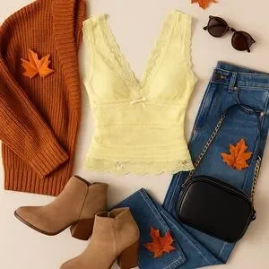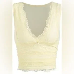This pale yellow lace camisole is the perfect mix of sweet and sultry. With delicate floral lace trim, a flattering v-neckline, and a dainty bow detail, it channels major Y2K and coquette vibes. Whether styled under a chunky cardigan for a cozy fall look or worn solo with wide-leg jeans for an edgy twist, this lingerie-inspired top brings flirty femininity to any outfit. A wardrobe essential for layering and trend-forward styling.