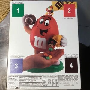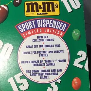 This candy dispenser is a limited edition and first in a collectible series. Great for Football fans. Perfect for football and tailgate parties. Holds 6 ounces of M&M’s Peanut chocolate candies. Pull down football arm and candy dispenses from helmet.