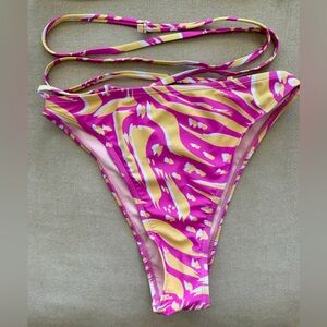 Stylish bikini set with vibrant pink and yellow pattern. Features a bandeau top and high-waisted bottoms. Perfect for a bold beach look.