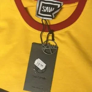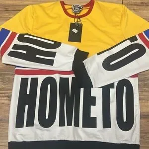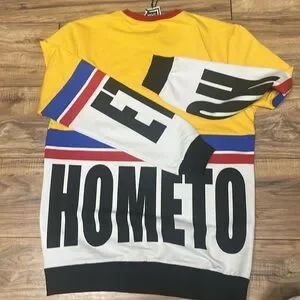 Vibrant sweatshirt with bold graphic design. Features yellow, red, blue, black, and white colors. It’s kind of between a sweatshirt and long sleeve t shirt in thickness