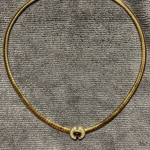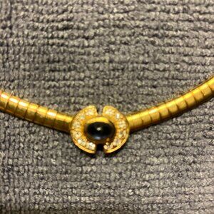 This 14K yellow gold necklace features a beautiful blue oval-shaped 1 ct. cabochon stone as the main focal point, accented with 12 sparkling melee diamonds. The necklace has a slide insert closure with a lock, making it secure and easy to wear. The luxurious choker style and domed chain add a touch of elegance to the piece, making it a stunning accessory for any outfit. Necklace is 14" wide x 15" long.
