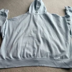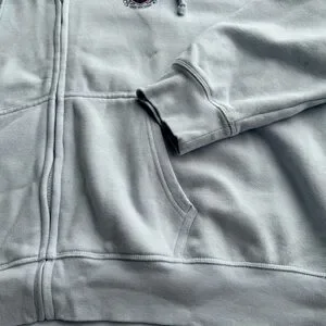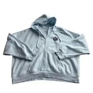 Soft sky blue hoodie with zip closure. Features front pockets and a cozy hood.