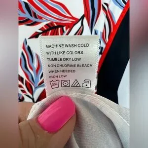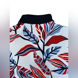 Sporty meets stylish in this TAIL Activewear “Lem Galleria” golf dress featuring a bold foliage print, moisture-wicking performance jersey, and a flattering A-line silhouette. Designed with an open V-neck, cherry tomato flat piping, navy side inserts, and zippered pockets for on-course convenience. Shorts not included.