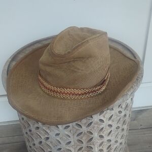 Stylish cowboy hat in tan. Features a decorative band with zigzag pattern. Perfect for western fashion.