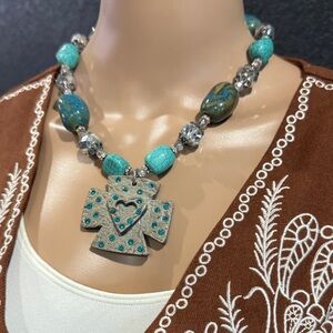Elevate your style with this stunning turquoise and silver cross pendant necklace. Perfect for any occasion.