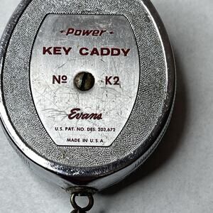 This vintage Evans Power Key Caddy No. K2 is a Made in USA retractable key holder with a belt clip design. It features a chrome metal case, original branding on the faceplate, and a retractable chain mechanism that functions smoothly. The back has a secure metal clip for attaching to belts or pockets. Patented under U.S. Pat. No. Des. 203,672, this piece was built for utility and durability. Approximately 2.5 inches.