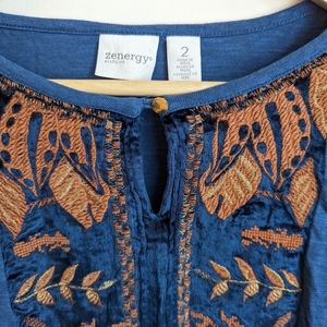 Chico's Blue and Bronze Embroidered Long Sleeve Top