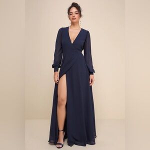 It's easy to be swept away by the romance of the Lulus My Whole Heart Dark Navy Blue Long Sleeve Wrap Dress! This twirly dress kicks things off with a sultry wrap bodice and long sheer sleeves (with gathering at the shoulder and covered button deets along the cuffs), all shaped by gauzy woven chiffon. A self tie cinches the fitted waist atop the full maxi skirt.