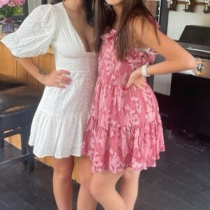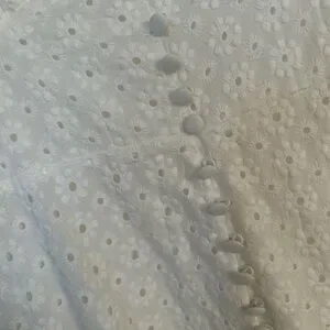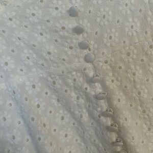 Chic white dress with eyelet floral details and gorgeous buttoning. Super flattering slim fit. Perfect for any occasion and only worn once!