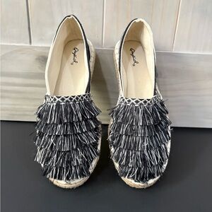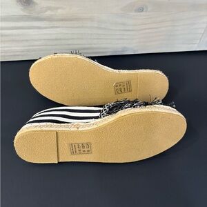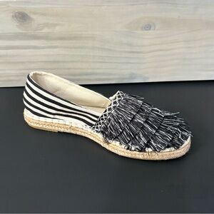 Chic and comfortable, these striped espadrille flats are perfect for casual outings. Featuring a stylish black and cream fringed design, they add a touch of elegance to any outfit. Size 8.5. NWOT.
