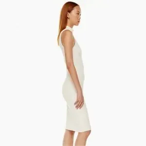 Chic and modern midi dress. Features a sleek sleeveless cut. Ideal for versatile styling.