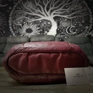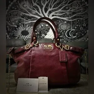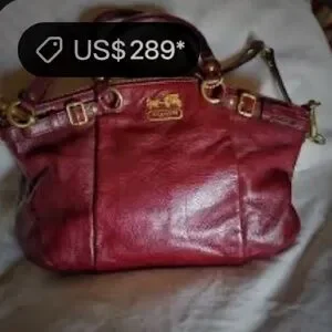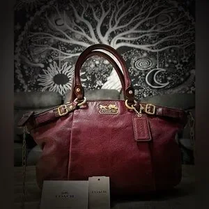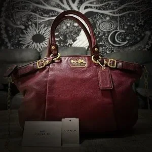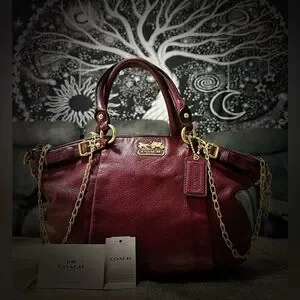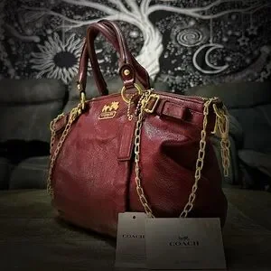 Vintage Y2K Coach dark red Maroon Leather Satchel with Gold Accents , Red vintage coach label number is No- J1220-F18609 , inside clean , normal used , soft leather, medium size , still good condition, have Crossbody strap, original price is $500, other people sale used $289, I only sale $159 low price sale , you can make offer too, is medium tote bag , is so cute and classy, so pretty , is perfect size , Sophisticated Coach satchel in maroon leather. Features elegant gold chain details. Ideal for versatile styling. Bag only will give you one dusty bag,