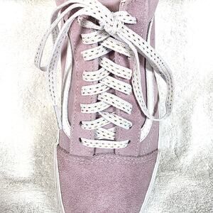 The Vans shoes are a size 10 Women's or Men's size 8.5.The Violet suede uppers have a strip of White Leather on each side. The new white replacement shoe laces have gold metallic threads that add a little sparkle. The soles are 1.75 inches thick rubber.