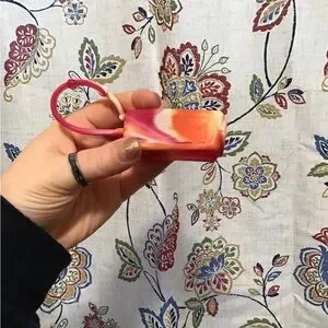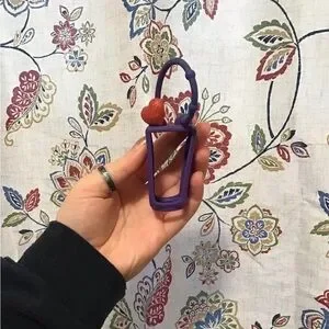 Set of three vintage Bath & Body Works Sanitizer Holders. One purple with a heart charm, one pink/ orange / white swirl, and one glittery blue and green.
