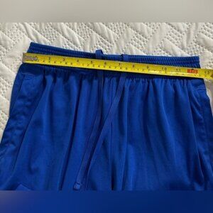"Elastic waist. Drawstring ties at waist. Teen or mens small. Royal blue. Rarely worn. Teen outgrew them. Generous length. Could be used for basketball. Made by Under Armour. Dri-fit athletic style. Smoke-free home. A couple small pulls snags. Perfect for spring/summer. Suitable for sport athletic preteen, teen or young man who loves Under Armour activewear. Smoke- and cat-free household.