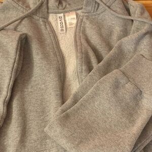 Comfortable gray zip-up hoodie with front pockets and drawstring hood. This hoodie size is Large but it fits like small