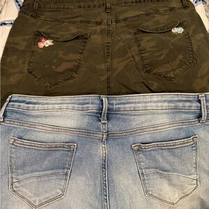 Chic jean shorts with colorful floral embroidery. And an army green camo with embroidery. Ideal for casual outings. 2 pair gently used shorts. Gently used
