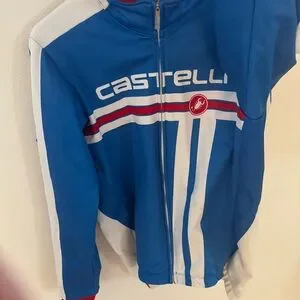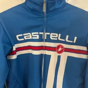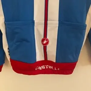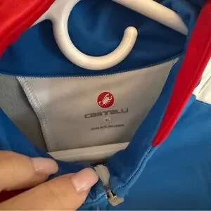 Castelli cycling jacket in blue and white with red accents. Features a full zip and logo details. A few marks and stains, shown in photos. Priced accordingly!