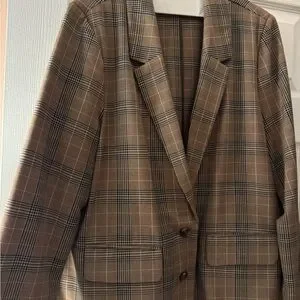 Stylish plaid blazer with an oversized fit. Features a tan and black check pattern. Ideal for versatile wear.