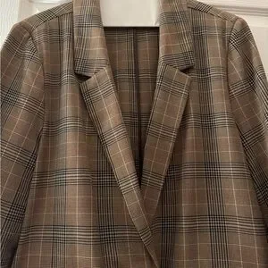 This is a lovely tan and black plaid blazer purchased from Old Navy that was worn 1 time and then dry-cleaned. It is size Large and meant to be oversized. Would be a perfect addition to your Fall wardrobe.